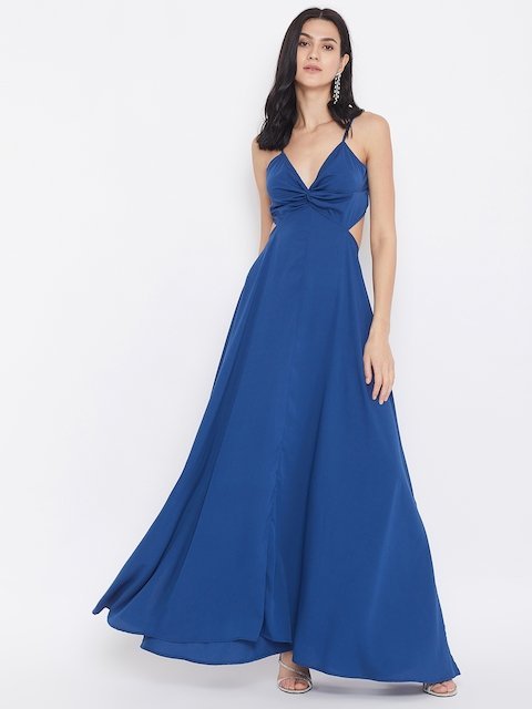 Blue solid woven maxi dress, has shoulder straps, sleeveless, and flared hem