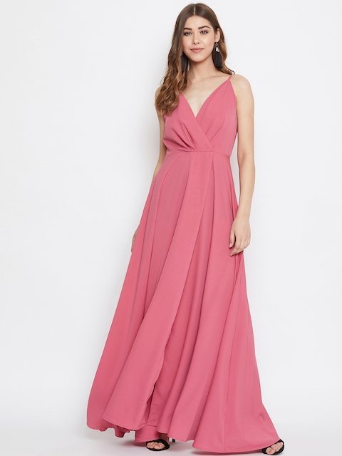 Pink solid woven maxi dress, has shoulder straps, sleeveless, concealed zip closure, and flared hem
