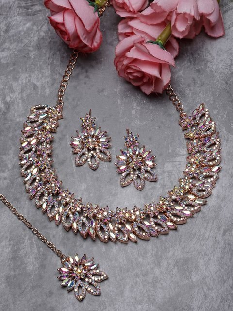 Rose Gold-toned & purple choker necklace has stones-studded and textured details, rose gold-plated