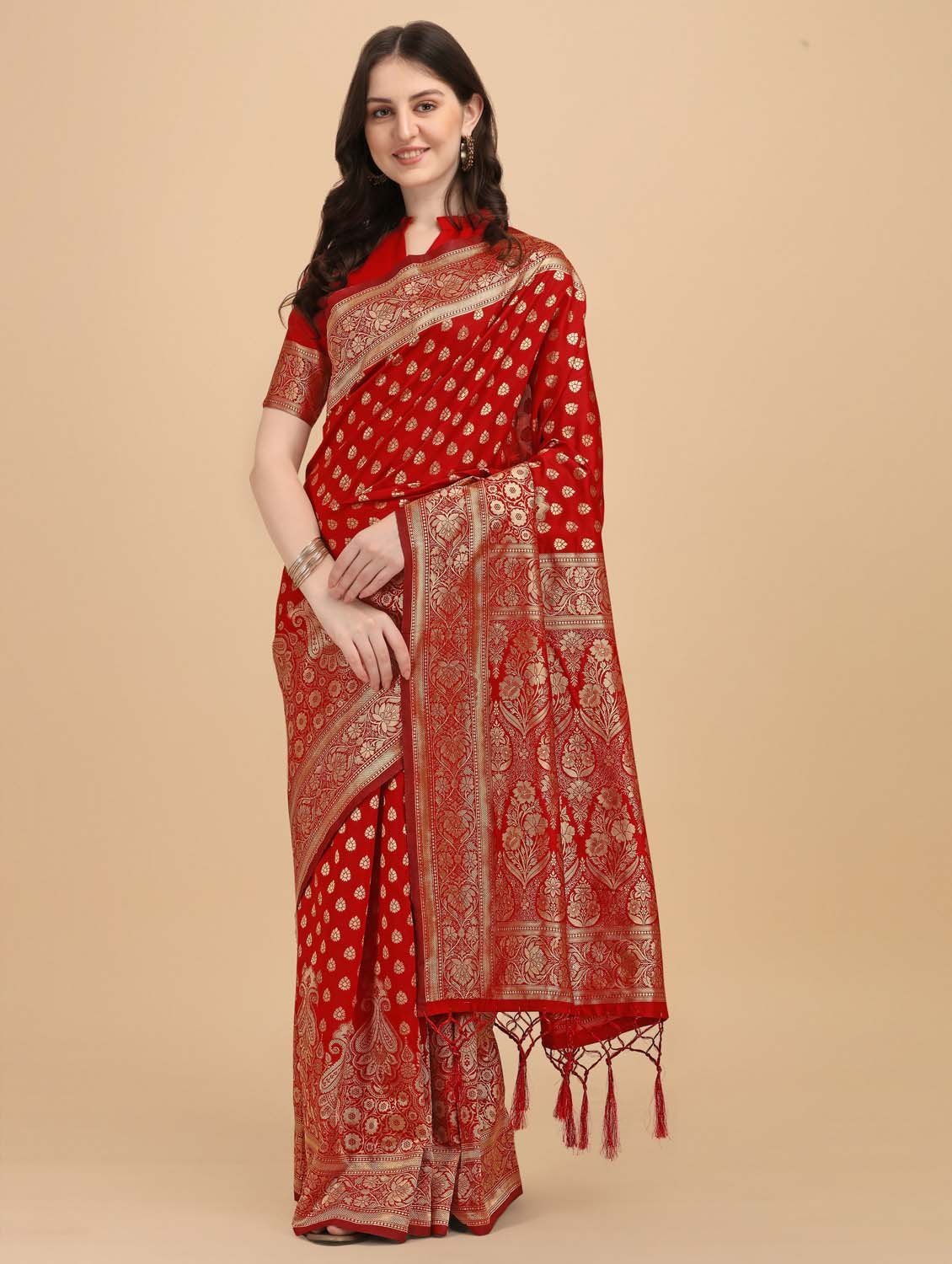 The saree comes with an unstitched blouse piece