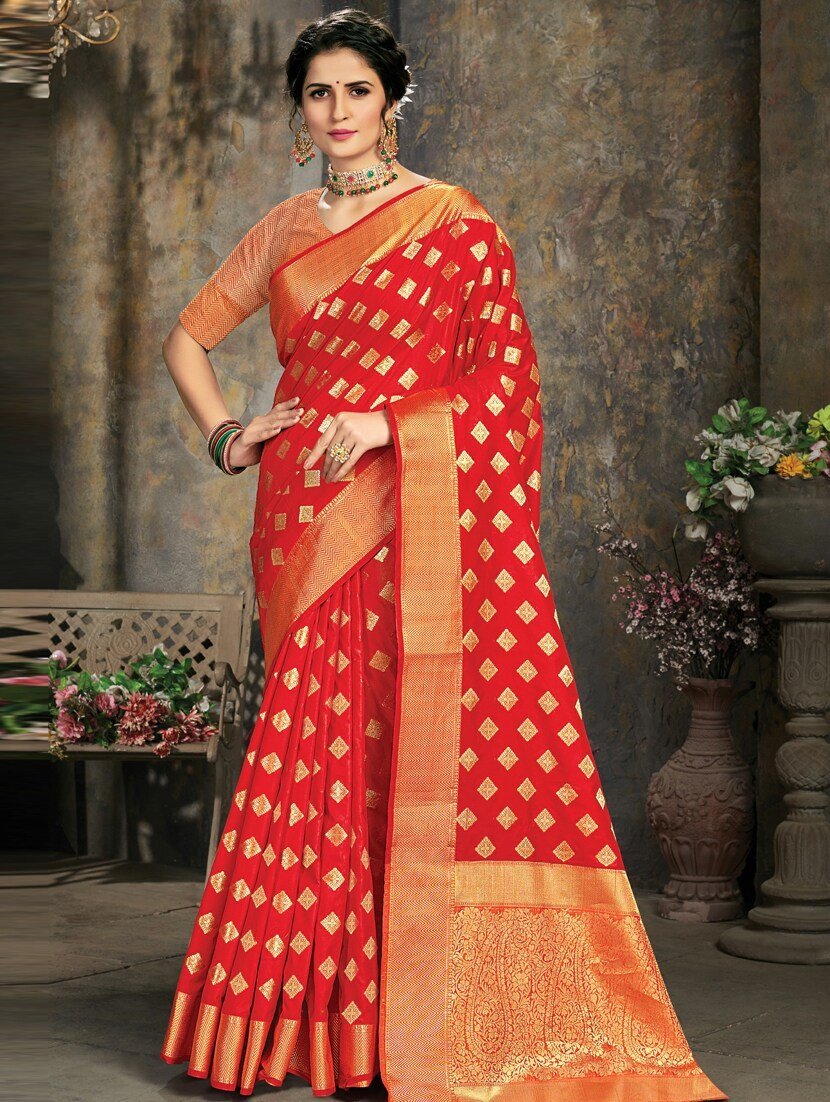 The saree comes with an unstitched blouse piece