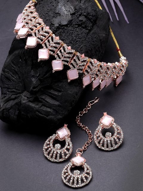 This jewellery set consists of a necklace, a pair of earrings and a maang tikka