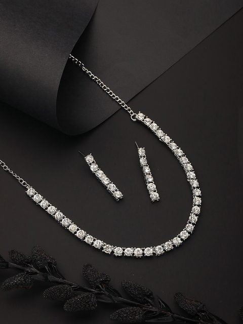 Silver-toned rhodium-plated necklace, has white american diamond-studded details