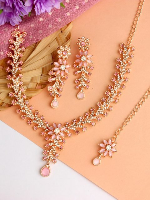 This jewellery set consists of a necklace, a pair of earrings and a maang tikka