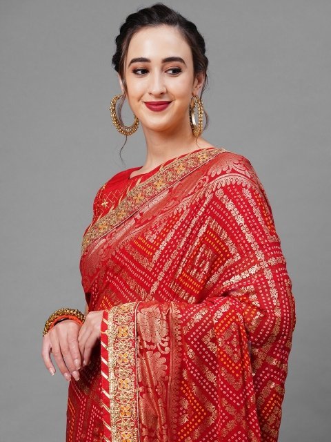 Mitera Red & Gold-Toned Woven Design Bandhani Saree