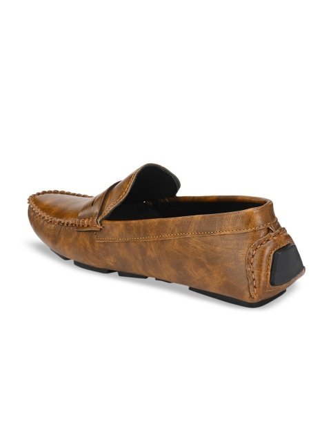 A pair of square toe brown loafers, has regular styling, slip-on detail