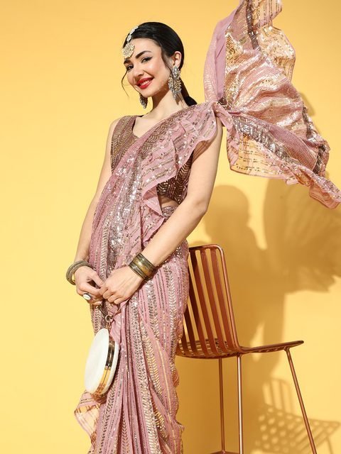 Add ethnic flair with eye-catching statement earrings, a pair of pretty chappals, and a cute metal nose ring