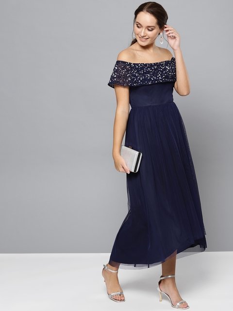 Navy Blue solid woven maxi dress with embellished detail, has an off-shoulder neck, short cape sleeves, concealed zip closure, an attached lining, and high-low hem